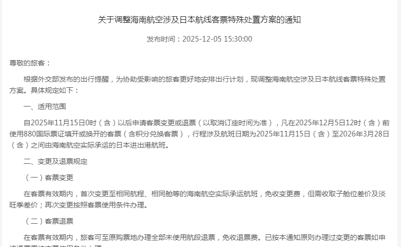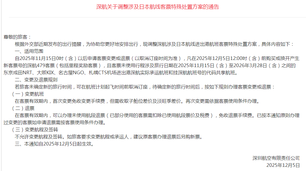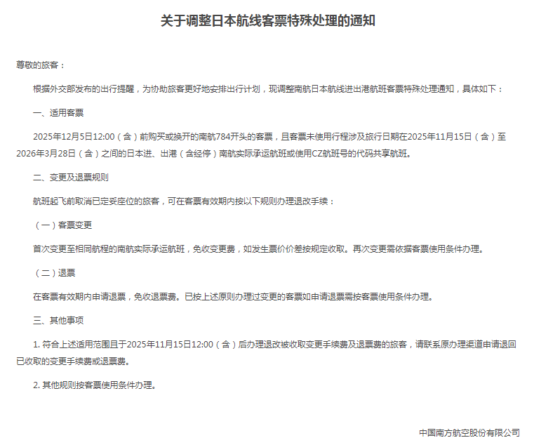 东航、南航等航司的通知类似,均为截至2026年3月28日前的涉日航线提供免费退改,该政策与11月15日众航司的相关通知类似。