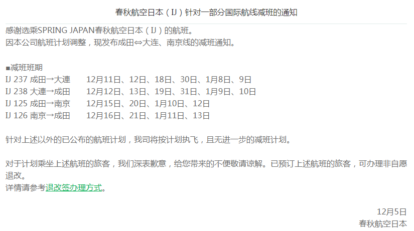记者注意到,春秋航空(601021)虽然没有发布免费退改政策,但是已经提前公告明年部分航班的减班信息。