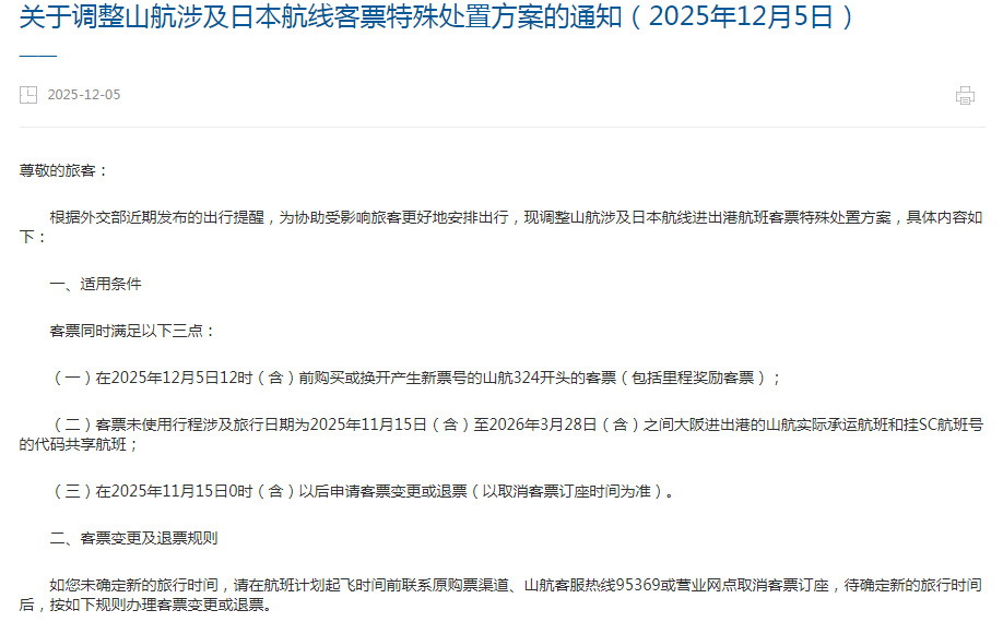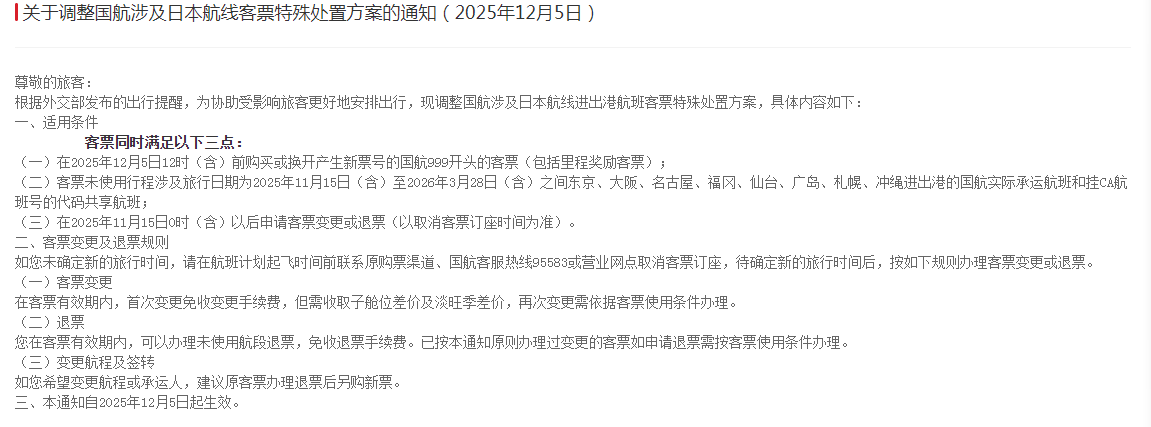 国航在通知中明确,对于在2025年12月5日12时(含)前购买或换开产生新票号的国航999开头的客票(包括里程奖励客票);客票未使用行程涉及旅行日期为2025年11月15日(含)至2026年3月28日(含)之间东京、大阪、名古屋、福冈、仙台、广岛、札幌、冲绳进出港的国航实际承运航班和挂CA航班号的代码共享航班;在2025年11月15日0时(含)以后申请客票变更或退票的这三种情况,首次变更免收变更手续费,退票也免收手续费。