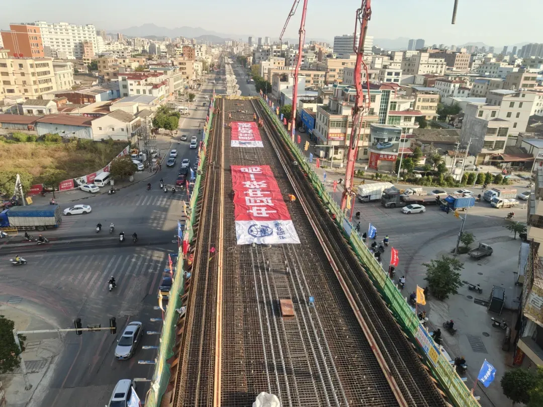 跨如意路连续梁位于潮州东站至如意站特大桥36号-39号墩,全长104.9米,桥面宽11.2米,设计浇筑混凝土1096.87立方米,主跨采用盘扣式满堂支架现浇法施工。为确保浇筑工作安全高效推进,项目建设团队制定详尽施工计划、优化人才机资源配置;围蔽前联合交管、公路部门开展多轮交通疏导模拟,增设加密护网与兜底平台构建全维度安全防护;施工中推行“网格化管理+穿透式监督”,严守“方案先行、样板引路”原则,标准化推进支架搭设、沉降观测等关键环节;浇筑前完成全员技术安全质量交底,明确工序责任、节点要求与作业流程,全程跟踪混凝土生产、运输、浇筑全流程管控,保障施工精准有序落地。